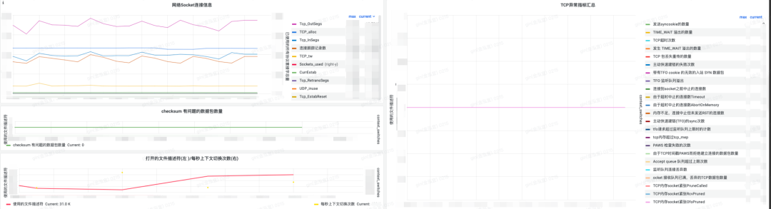 有了采集后就是完成指标的展示与统计,我们通过/proc/net/netstat获取到了46个网络指标,同时也借鉴了业内的最佳实践总共55个指标的罗列与代表的意义,并将各内核常见参数 含义及公式形成文档,解决了很多参数不目的不明确的问题,下图是我们展示这些指标的案例截图