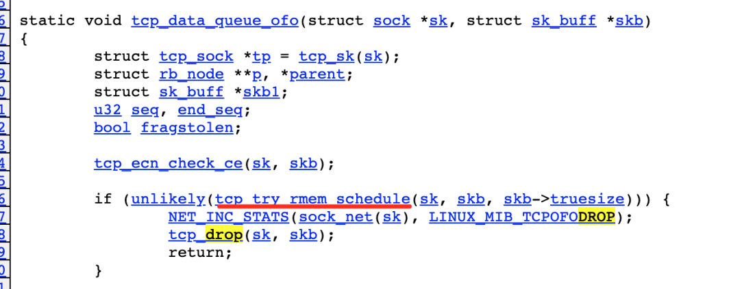 绕了一圈发现线索又断了,还是回到那个TCP 内存限制的问题,为什么会判断tcpofodrop 指标会与tcp_mem 有关呢?可以直接看代码逻辑