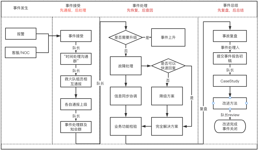 CL(Communication Lead):沟通引导,负责对内和对外的信息收集及通报,这个角色一般相对固定,由技术支持、QA或者是某个SRE来承担,要求沟通表达能力要比较好。