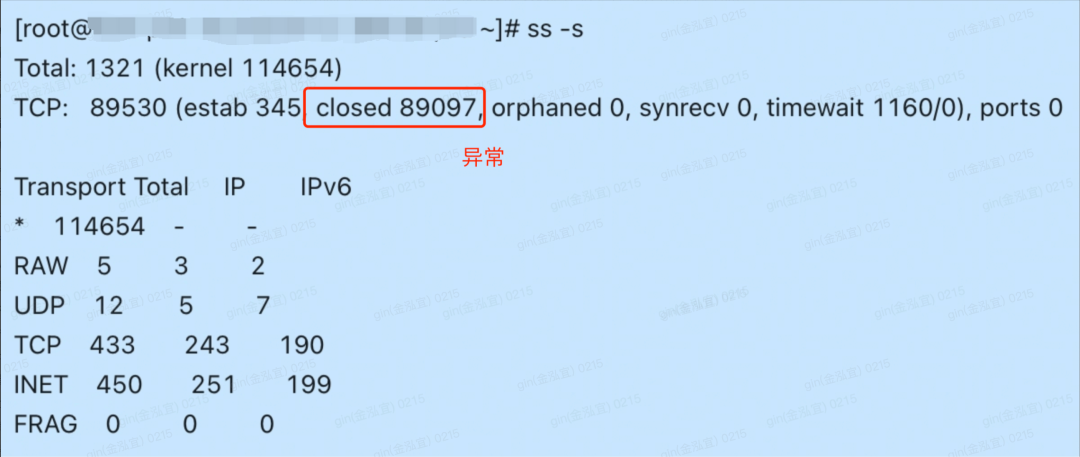 在check这些参数的过程中突然就发现了一个问题,我们线上的参数换算成内存值是48G左右,已经算大了,可以想象一下 tcp 链接总的内存已经用了48G!这部分还不光是网络开销只是一个 TCP 链接,我们就有 ss 看了下当时的链接情况: