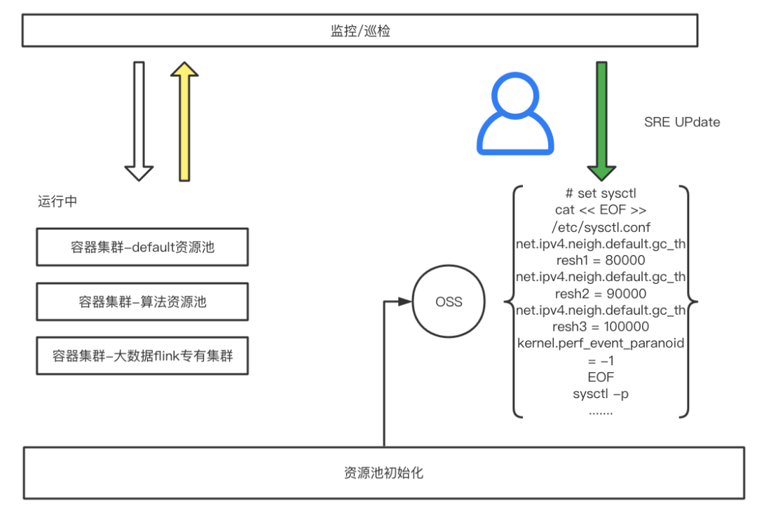 有整理出的内核指标后还会通过日常的监控、巡检对某些需要调整的内核参数做出修改,由于是wget统一拉取的,所以在update的时候只要通过修改oss里面的批量类型init.sh就可以做到了,不需要修改每一个资源池配置