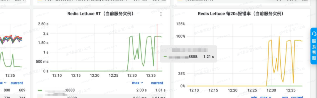 某天下午SRE侧开始陆续接到业务研发反馈redisRT 增长导致超时,其中某服务有多个 pod 存在redis RT 突增导致部分请求超时(截图如下)