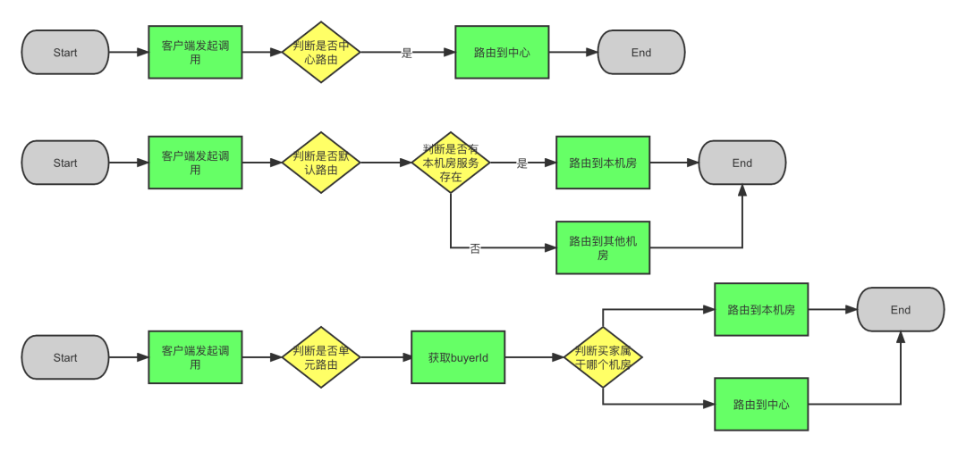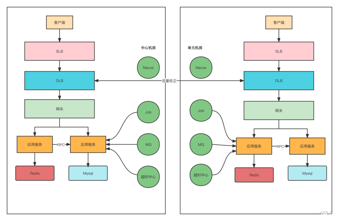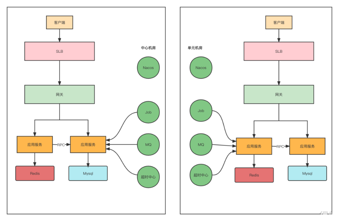 请求到单元机房,那么直接调用中心机房的服务,中心机房没有服务则报错。请求到中心机房,那么就本机房调用。