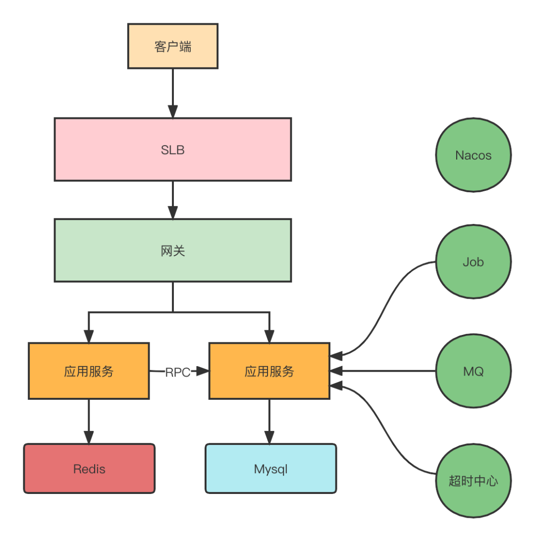 如上图所示,客户端的请求进来会先到SLB(负载均衡),然后到我们内部的网关,通过网关再分发到具体的业务服务。业务服务会依赖Redis、Mysql、 MQ、Nacos等中间件。