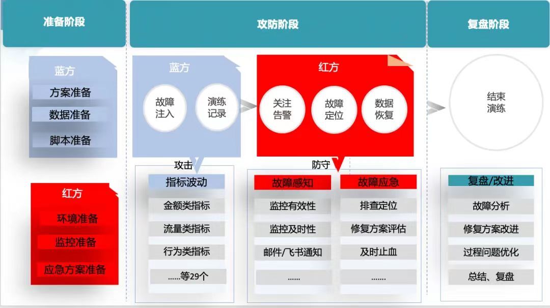整体演练过程,大致分为三个阶段:准备阶段、攻防阶段及复盘阶段。