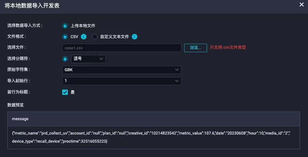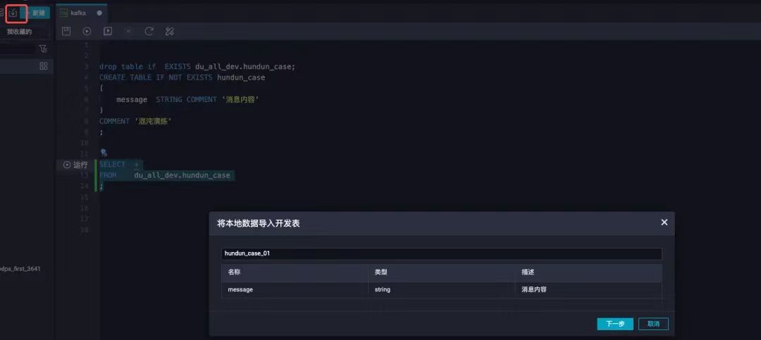 导入前,需要在datawork空间中新建测试表du_qa_dw_dev.hundun_case,用于导入演练数据
