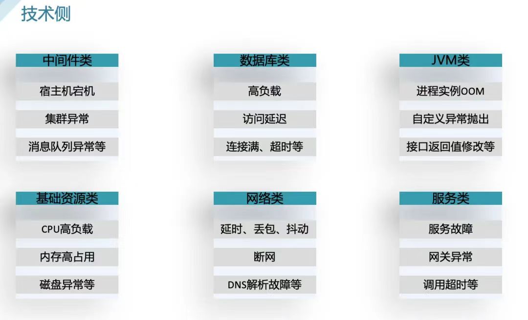 技术侧混沌:基于中间件、数据库、JVM、基础资源、网络、服务等注入常见的异常,根据实际业务中梳理的应用核心场景进行混沌演练,检验系统的脆弱性和应急响应能力,从而提升团队的稳定性保障处理能力。