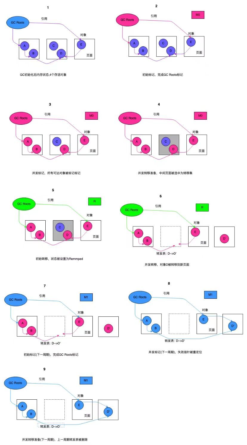 为了说明ZGC算法,下图演示了示例中的所有阶段。