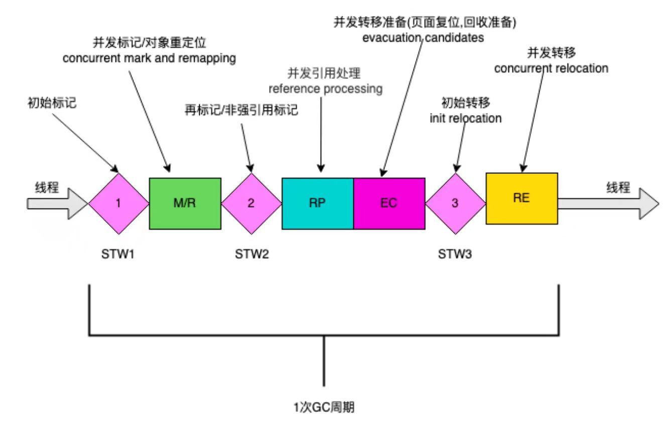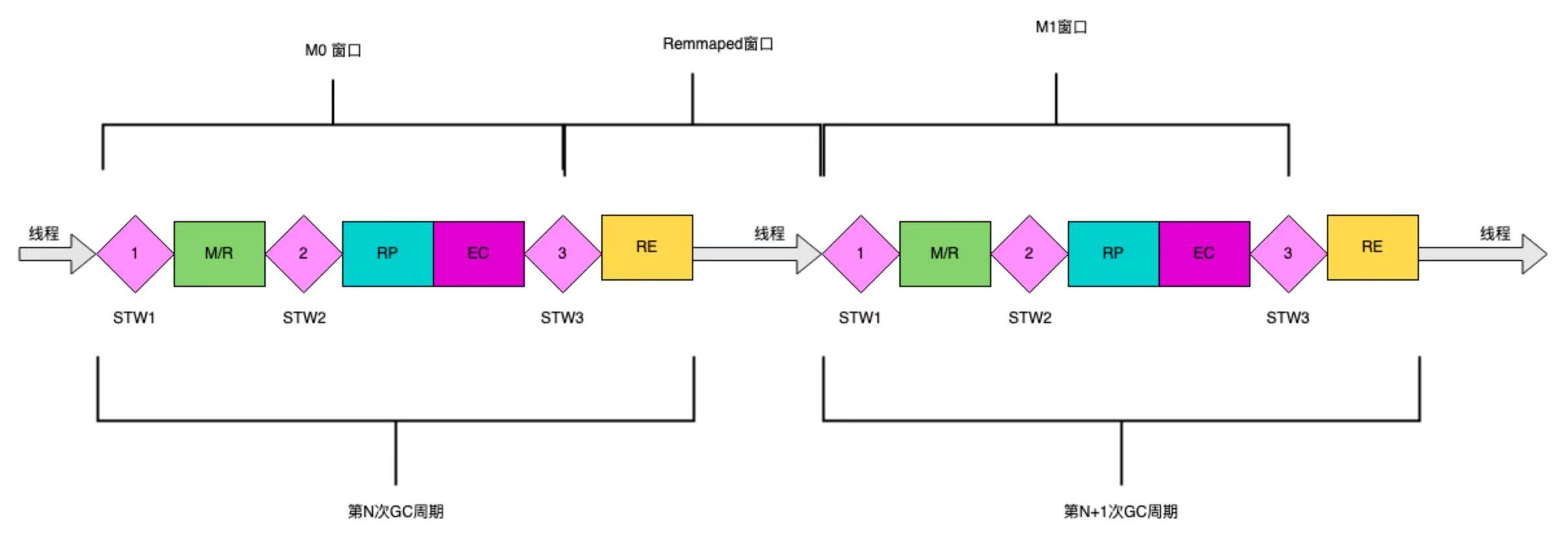 如下图 所示,ZGC 周期由三个 STW 暂停和四个并发阶段组成:标记/重新映射( M/R )、并发引用处理( RP )、并发转移准备( EC ) 和并发转移( RE )。为了读者能快速理解,下面对ZGC执行过程进行了大量简化。