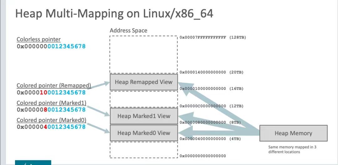 通过设置地址元位的状态,可以形成不同地址视图,ZGC同一物理堆内存被映射到虚拟地址空间三次,从而产生同一物理内存的三个“视图”,GC活动的不同时期会只存在一个活跃视图,根据垃圾回收的周期ZGC通过切换不同视图标来记出对象的颜色。