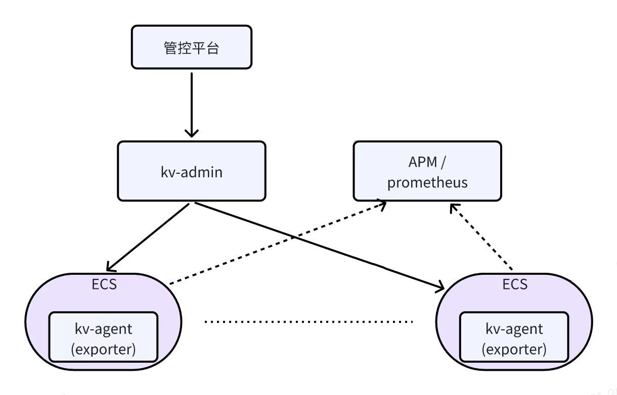 每个 ECS 上会部署一个 Kv-Agent 组件,Kv-Agent 负责完成实例部署、实例启停等操作;基于心跳元数据的 Exporter 自动注册与解除;
