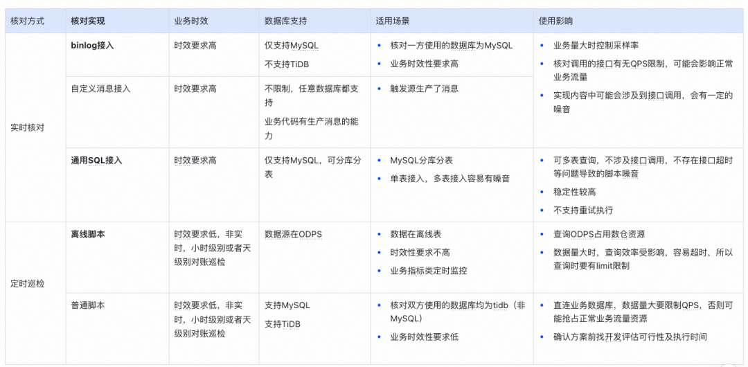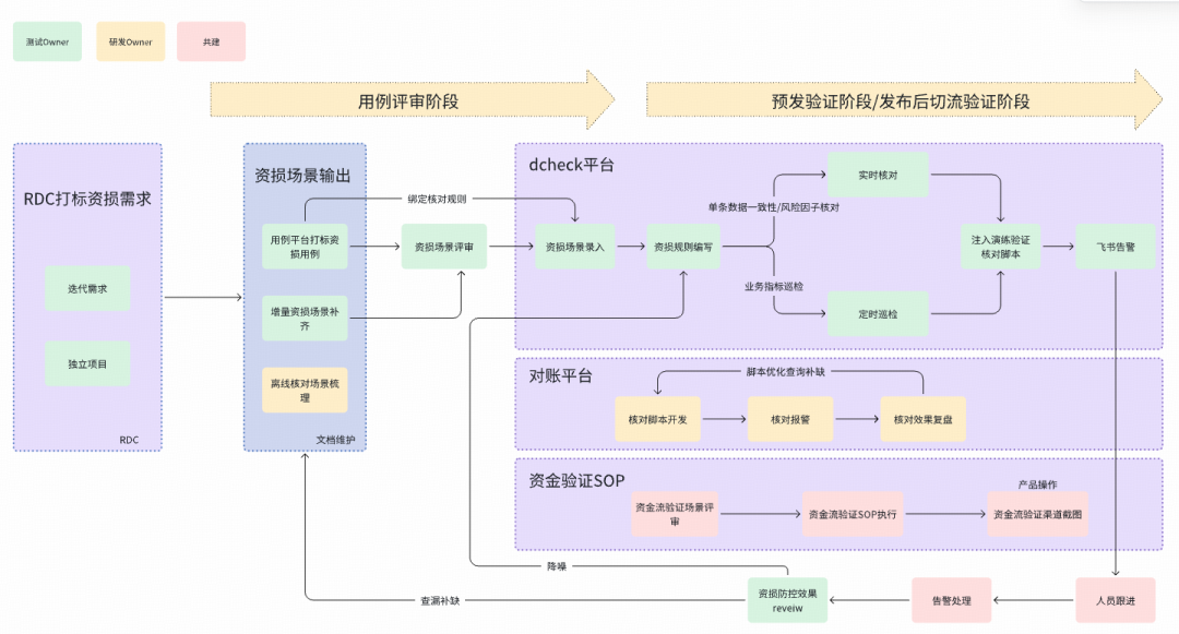 研发测试分工:目前迭代或独立项目通过Dcheck方式实现的资损场景主要是测试负责推进,一般在项目开展时或项目灰度前推进完成。涉及的资损场景,测试会邀请开发进行评审。对账平台实现的离线核对场景及实现主要是开发负责,一般偏于迭代测试周或者后续迭代进行开发实施,测试参与度低。