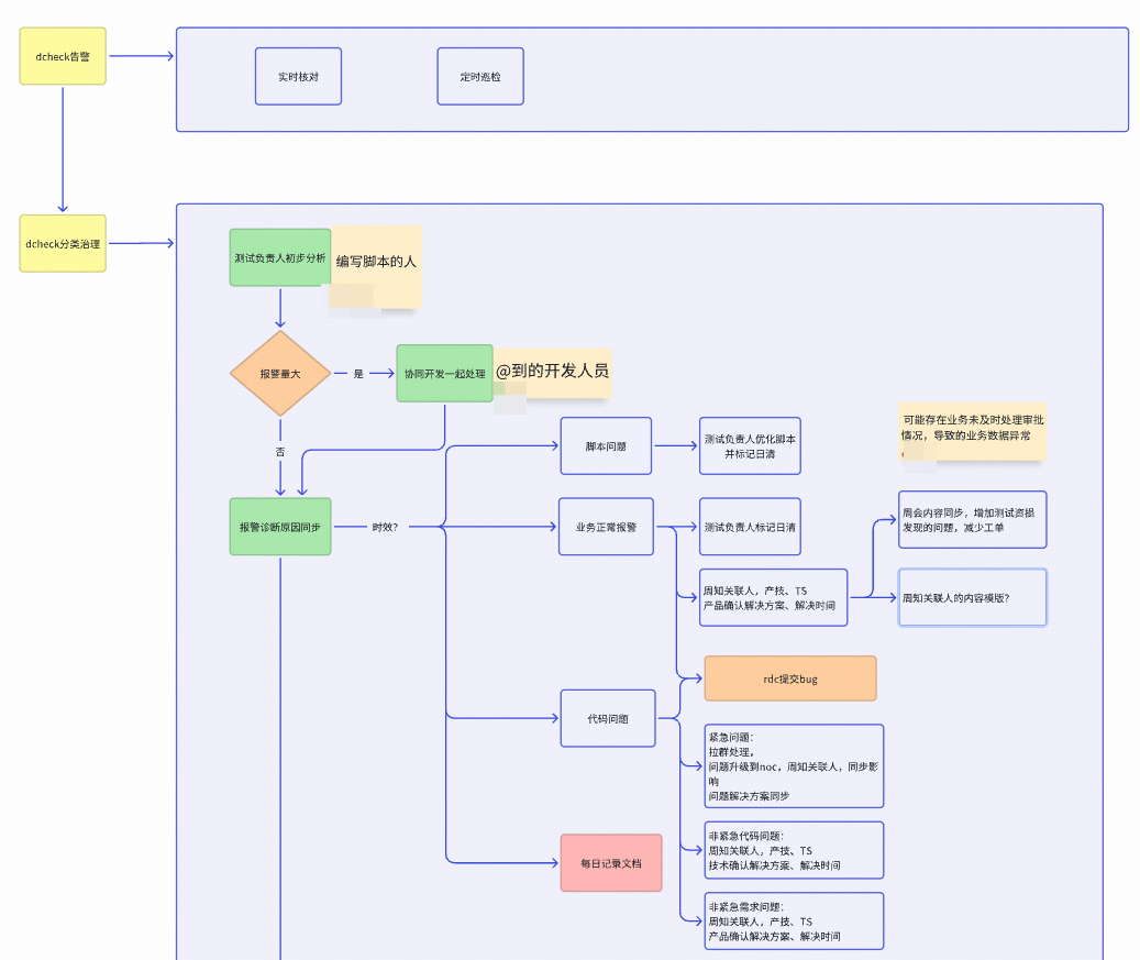 关于Dcheck规则报警,测试报警后会做初步排查,然后确定不是脚本问题后@对应的开发介入处理,开发负责协助进行问题分析,如果是代码bug或者数据问题,开发进行紧急或者排期修复。