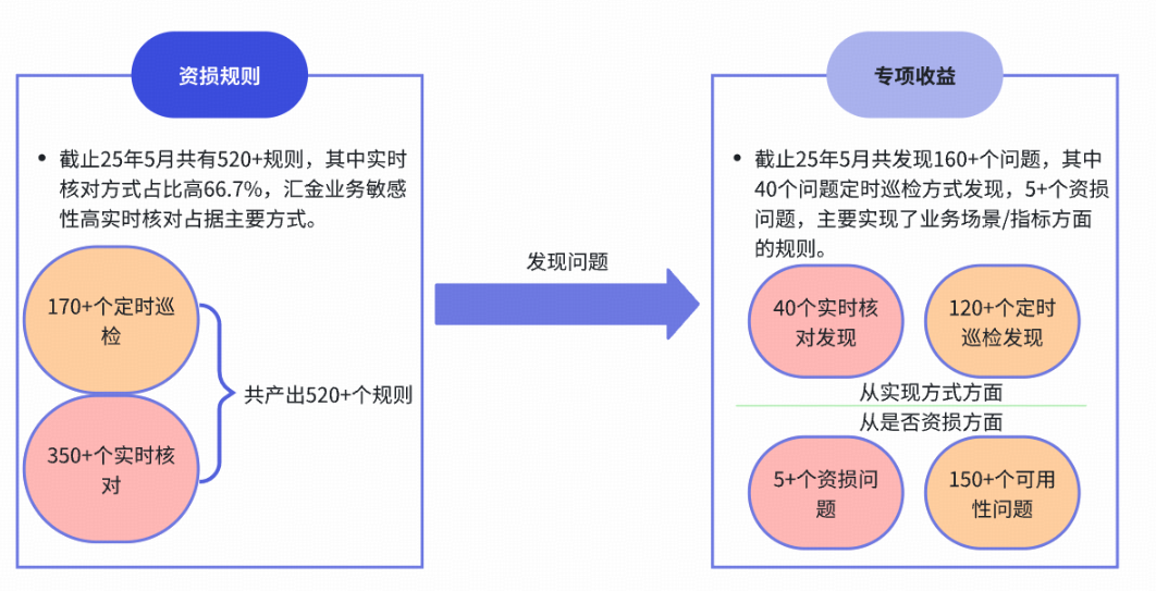 自2024年全年至2025年5月共完成了520+个规则,发现了160+个问题。其中5+个问题为资损问题,155+个非资损问题。有效遏制了线上的资损发生和有效保障了线上稳定性。