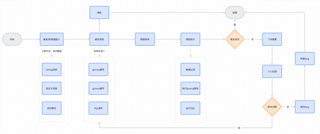 通过实时监听binlog消息/自定义消息/实时数仓消息,触发规则核对。监听binlog和自定义消息的脚本要用Groovy实现,监听实时数仓消息要用SQL实现,Groovy实现的规则会涉及到接口间调用,会出现超时发布导致调用不同的情况,稳定性有一定影响。用SQL实现相比起来更灵活更稳定。监听实时数仓的前提是数据源要接入实时模版平台。