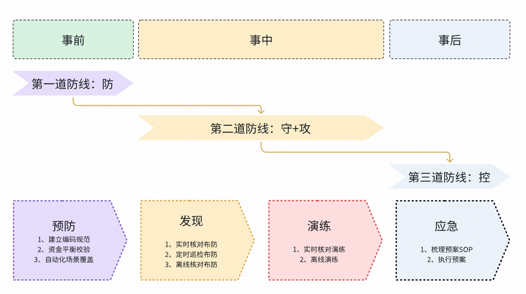 关注的内容:系统出现问题后,是否有实时或者非实时的告警能力。对于告警内容,要根据业务优先级及系统实现,编写实时/非实时核对脚本。如果业务复杂性高,可以编写抽检脚本,就是系统实现的重算逻辑,从旁路发现问题。那么如何验证脚本有效性,发现问题是否进行报警,就要进行攻防演练。通过演练,可以检查是否具备问题的能力,以及开发的响应能力,如果不达标,要进行改进和优化直到达标。