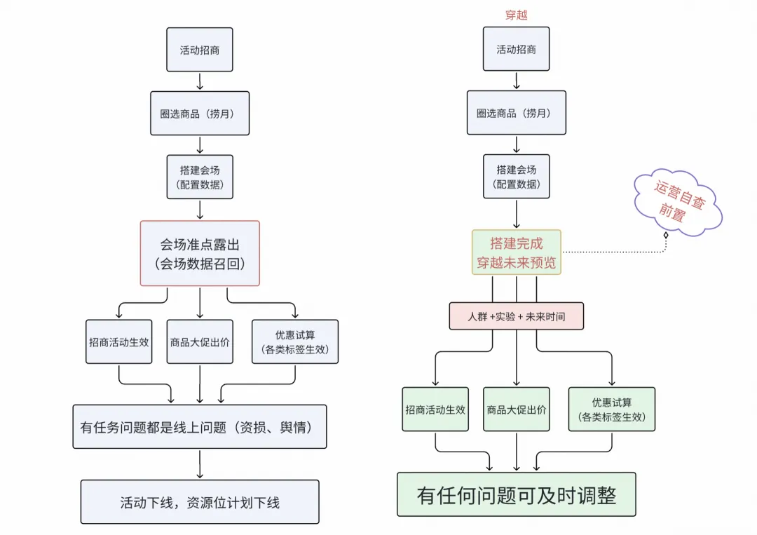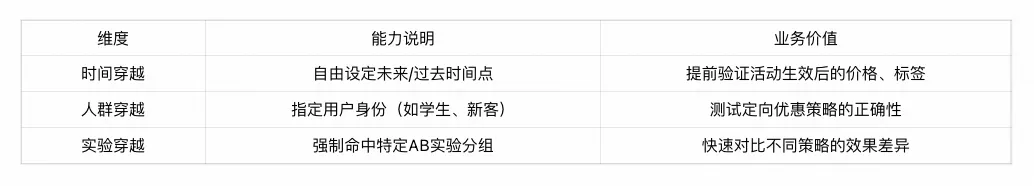 - 价值:时间+人群+实验穿越减少运营流量计划重复配置,提前预览活动氛围和投放效果。