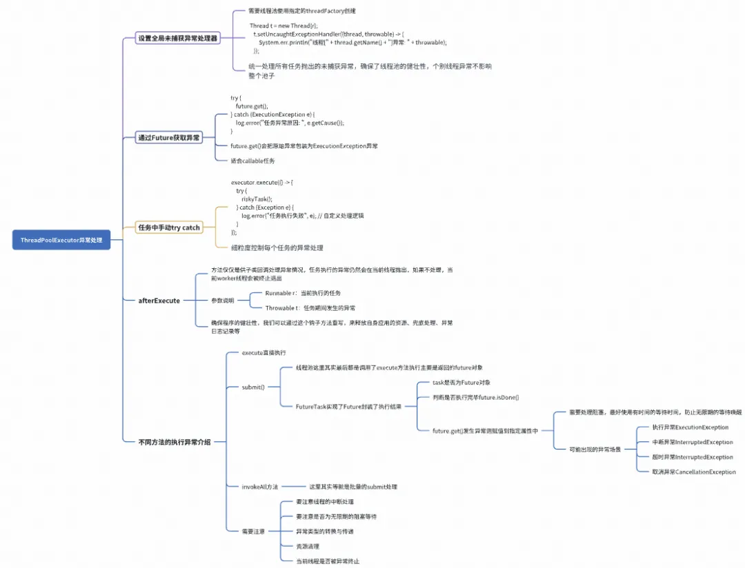 - 异常处理:通过afterExecute来对发生的异常进行兜底处理,任务细粒度的try catch或UncaughtExceptionH捕获异常处理防止线程崩溃退出;