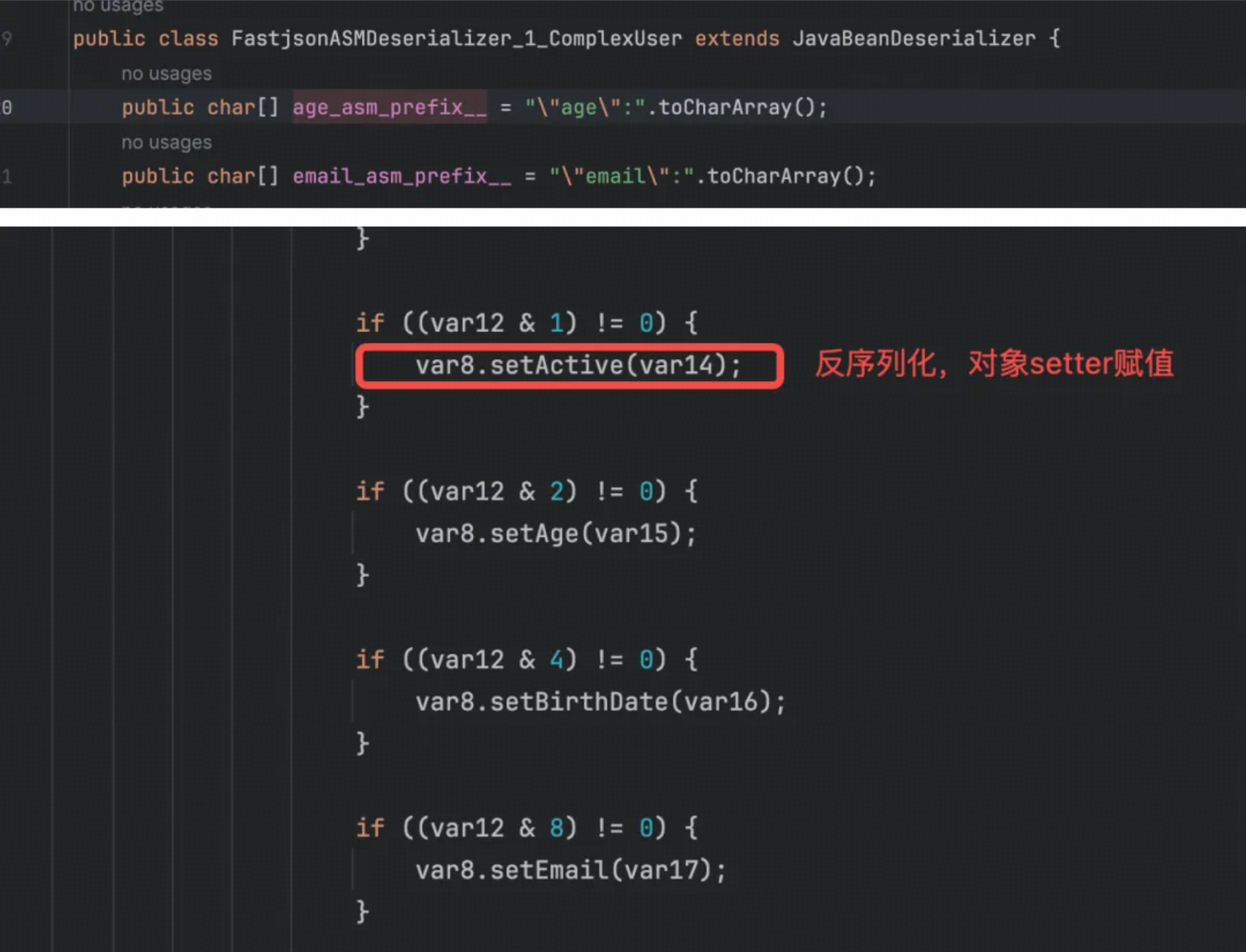 - ASMDeserializerFactory.java: 与序列化类似,它动态生成反序列化器字节码,直接调用 setter 方法或直接对字段赋值,避免了反射。