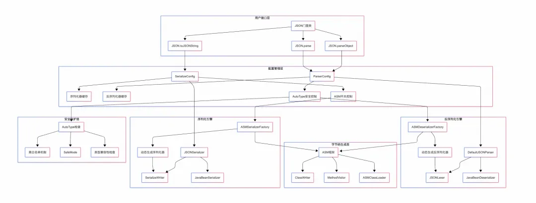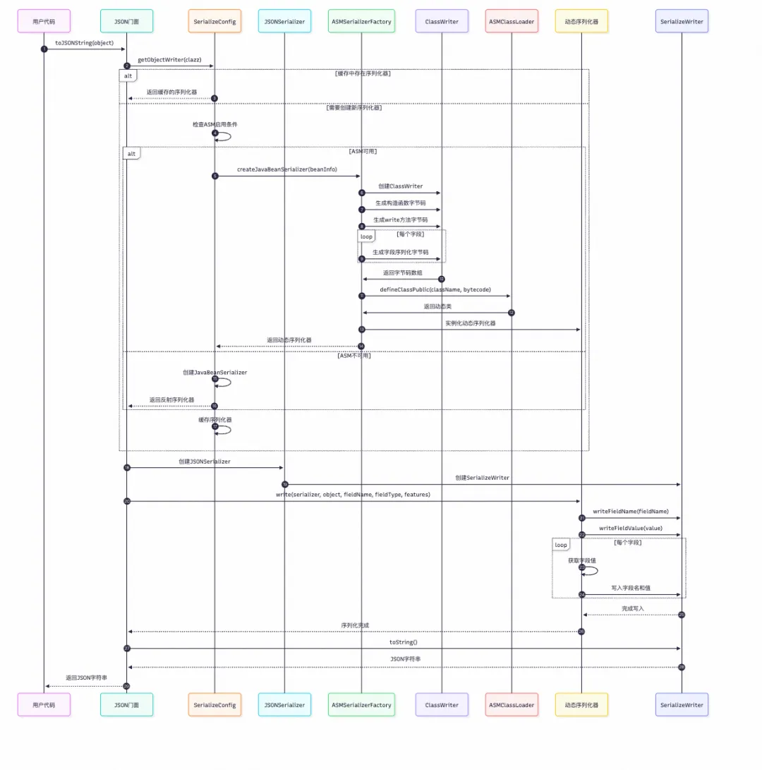 - ASMSerializerFactory.java: 性能优化的核心 。它使用 ASM 字节码技术在运行时动态生成序列化器类,这些类直接调用 getter 方法并操作SerializeWriter,避免了反射的性能开销。
