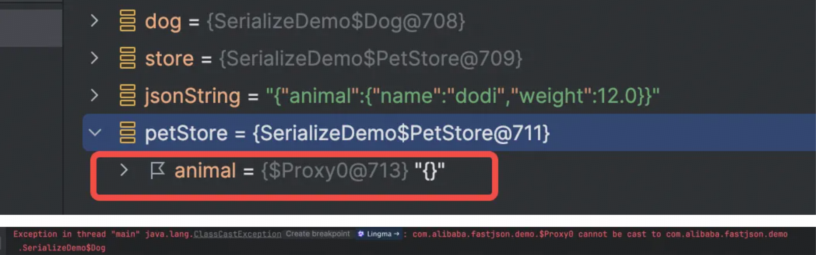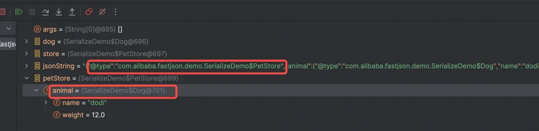 在未开启AutoType机制情况下,在将store对象序列化成JSON串后,再反序列化为对象时由于字段的类型为接口无法转换成具体的Dog类型示例;开启AutoType机制后,序列化时将类型一并写入到JSON串内,后续进行反序列化时可以根据这个类型还原成具体的类型实例。