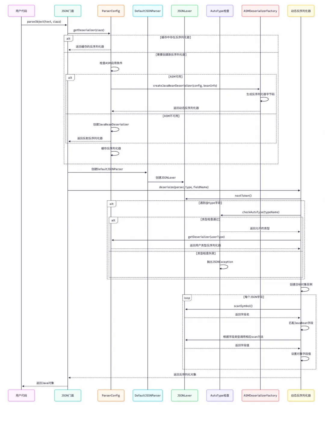 - JavaBeanDeserializer.java: 默认的 JavaBean 反序列化器。在未启用 ASM 优化时,它通过反射创建对象实例并设置其属性值。