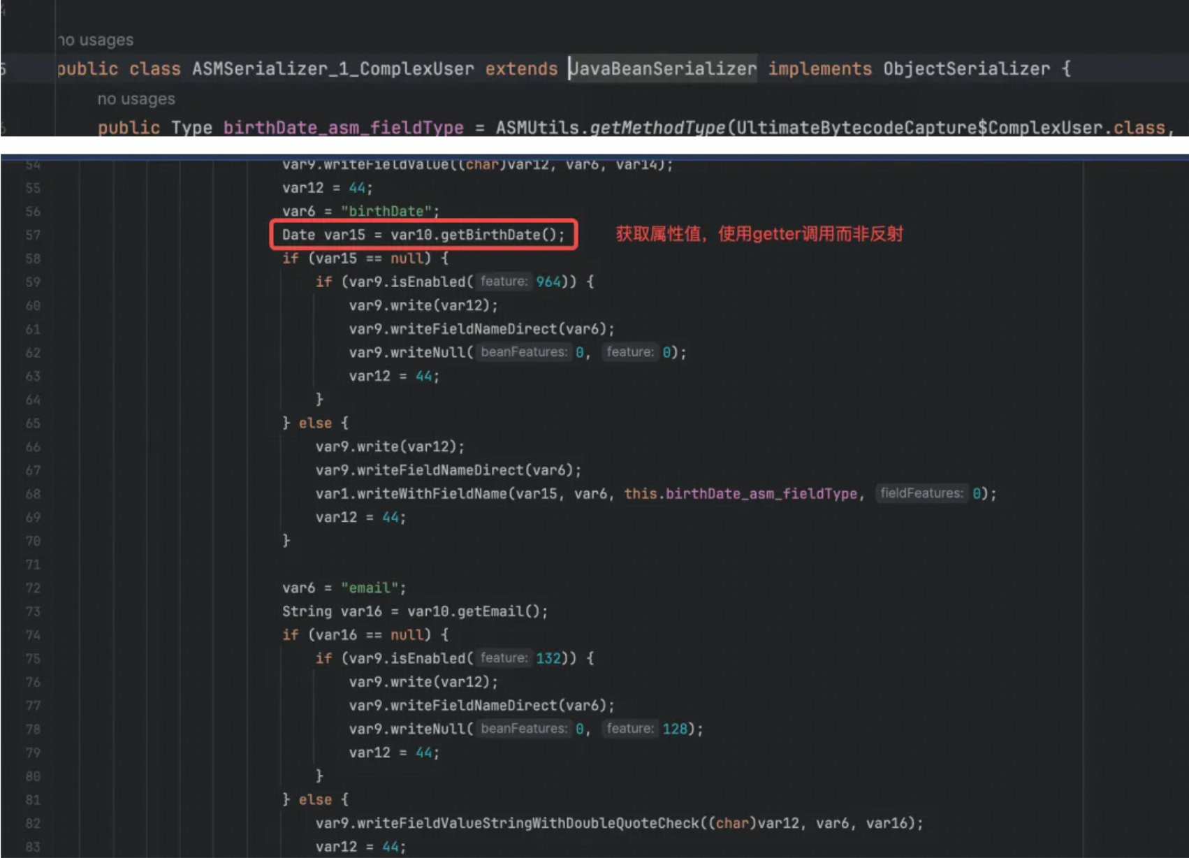 ASM 是 fastjson 类似于 JIT,在运行时把「反射调用」翻译成「直接字段访问 + 方法调用」的字节码,从而把序列化/反序列化性能提升 20% 以上,当然随着JVM对反射性能的优化性能差正在逐渐被缩小。下图是作者使用工具类读取的动态序列化/反序列化器源码片段。