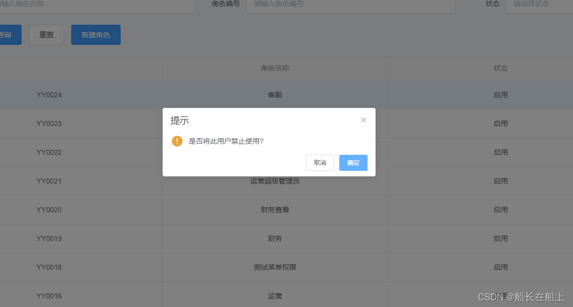 - 角色列表查询,通过(角色名称;角色编号;状态:启用、禁用)进行角色数据搜索。