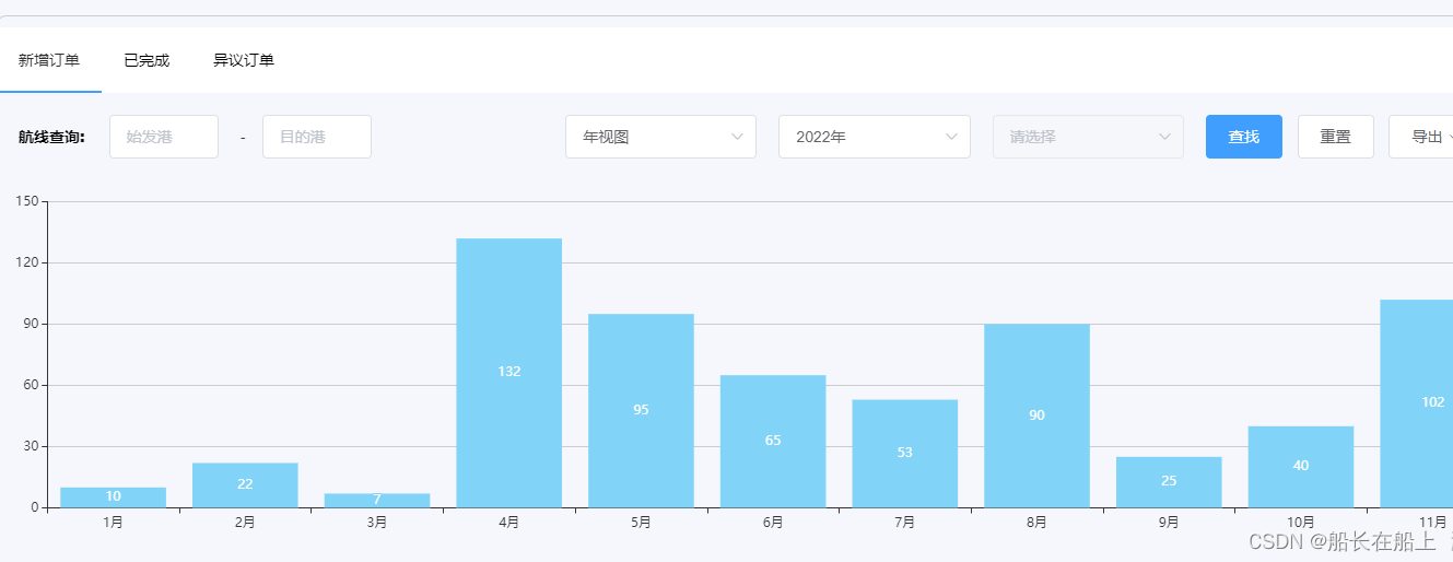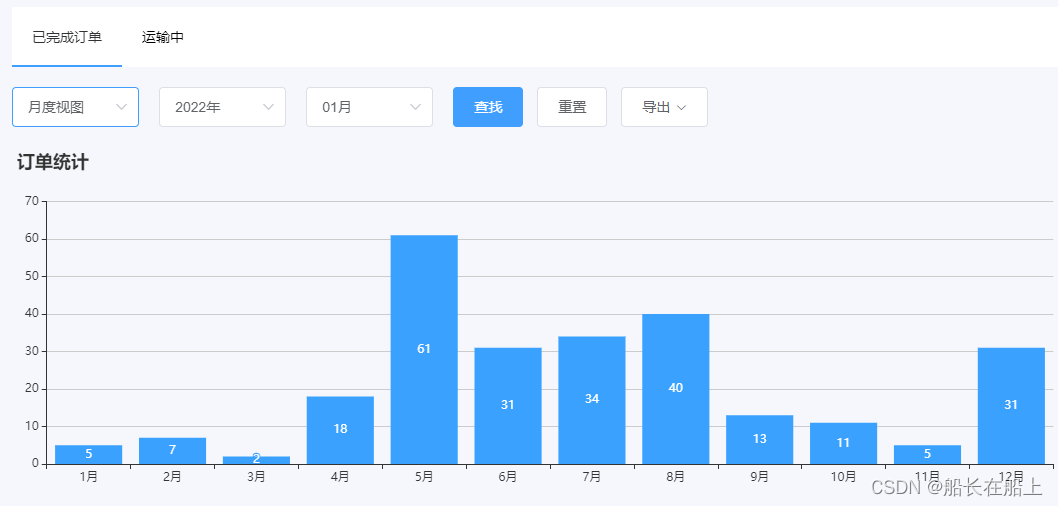 本文介绍了一个基于Vue.js的后台管理系统如何利用ECharts实现订单统计功能,包括不同订单状态的柱状图展示、年月视图切换、数据查询、重置、导出(Excel和PDF)以及柱状图的自适应配置。详细讲解了数据获取方法和关键代码实现。