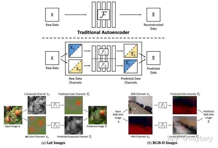 这种基于预测颜色的生成模型带给了人们新的启发,其实这种灰度图和 ab 域的信息我们可以当做是一张图片的解耦表达,所以只要是解耦的特征,我们都可以通过这种方式互相监督的学习表征,著名的 Split-Brain Autoencoders [12] 就在做这样一件事情。对于原始数据,首先分成两部分,然后通过一部分的信息来预测另一部分,最后再合成完成的数据。和传统编码器不同的是,这种预测的方式可以促使模型真正读懂数据的语义信息才能够实现,所以相当于间接地约束编码器不单单靠 pixel-wise 层面来训练,而要同时考虑更多的语义信息。