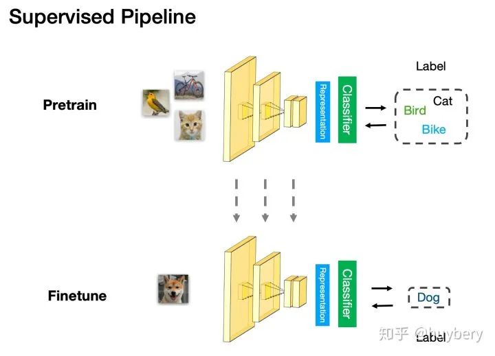 对于第三点,评测自监督学习的能力,主要是通过 Pretrain-Fintune 的模式。我们首先回顾下监督学习中的 Pretrain - Finetune 流程:我们首先从大量的有标签数据上进行训练,得到预训练的模型,然后对于新的下游任务(Downstream task),我们将学习到的参数进行迁移,在新的有标签任务上进行「微调」,从而得到一个能适应新任务的网络。而自监督的 Pretrain - Finetune 流程:首先从大量的无标签数据中通过 pretext 来训练网络,得到预训练的模型,然后对于新的下游任务,和监督学习一样,迁移学习到的参数后微调即可。所以自监督学习的能力主要由下游任务的性能来体现。