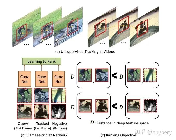 还有一种想法是来自 @Xiaolong Wang 大佬 ICCV 2015 [18]的基于无监督追踪方法,首先在大量的无标签视频中进行无监督追踪,获取大量的物体追踪框。那么对于一个物体追踪框在不同帧的特征应该是相似的(positive),而对于不同物体的追踪框中的特征应该是不相似的(negative)。