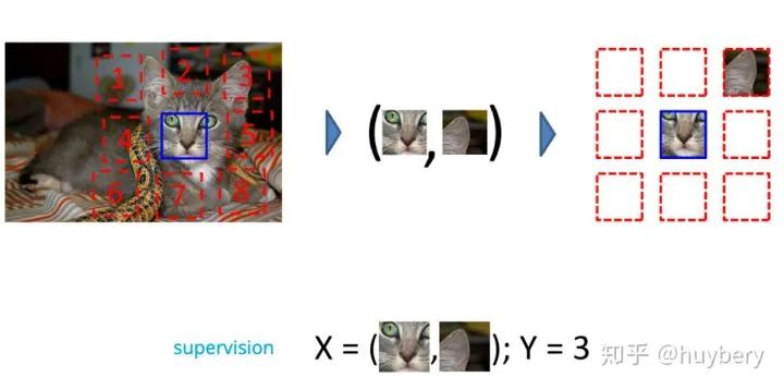 而在图像中,研究人员通过一种名为 Jigsaw(拼图)[7] 的方式来构造辅助任务。我们可以将一张图分成 9 个部分,然后通过预测这几个部分的相对位置来产生损失。比如我们输入这张图中的小猫的眼睛和右耳朵,期待让模型学习到猫的右耳朵是在脸部的右上方的,如果模型能很好的完成这个任务,那么我们就可以认为模型学习到的表征是具有语义信息的。