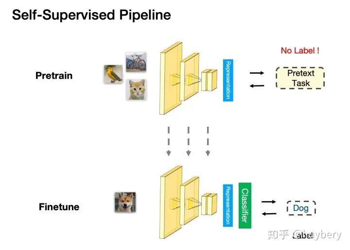 自监督学习主要是利用辅助任务(pretext)从大规模的无监督数据中挖掘自身的监督信息,通过这种构造的监督信息对网络进行训练,从而可以学习到对下游任务有价值的表征。