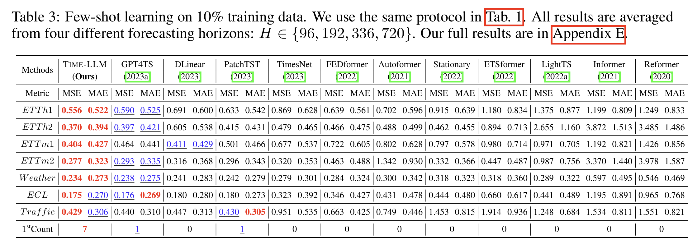 少样本预测是 TIME-LLM 的强项之一。实验发现: