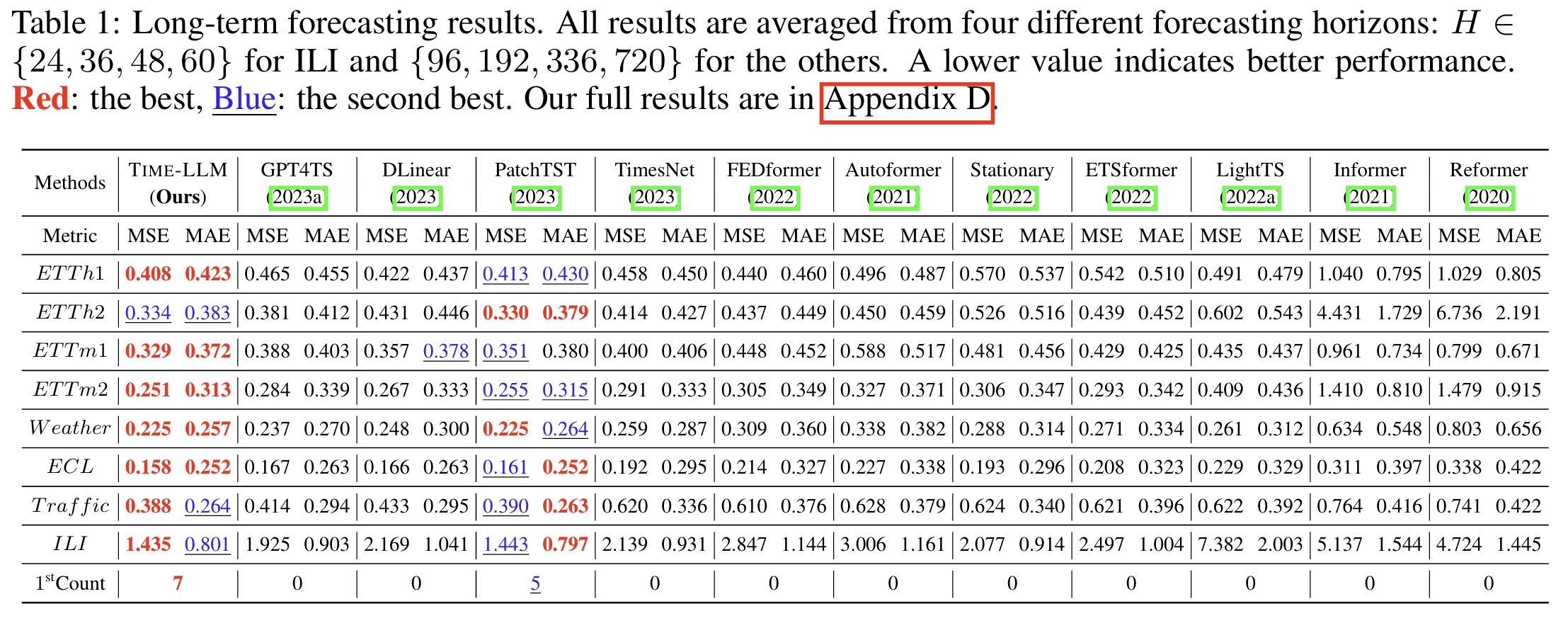 在所有四个 ETT 数据集以及 Electricity、Weather、Traffic 等数据集上,TIME-LLM 在 96 / 192 / 336 / 720 步预测中都获得了最优或近似最优结果。