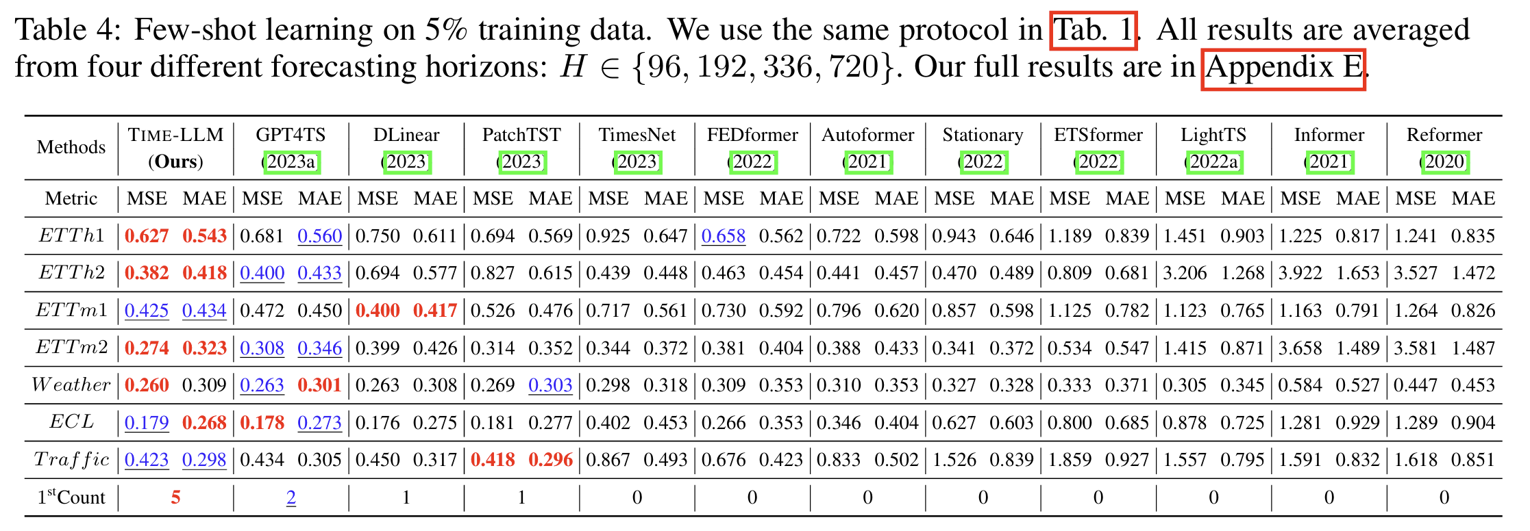 仅使用 5% 的训练数据,TIME-LLM 仍明显优于 GPT4TS、PatchTST、TimesNet