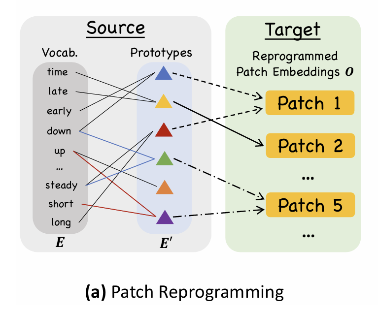 通过 cross-attention,将 patch 重编程为这些原型的组合