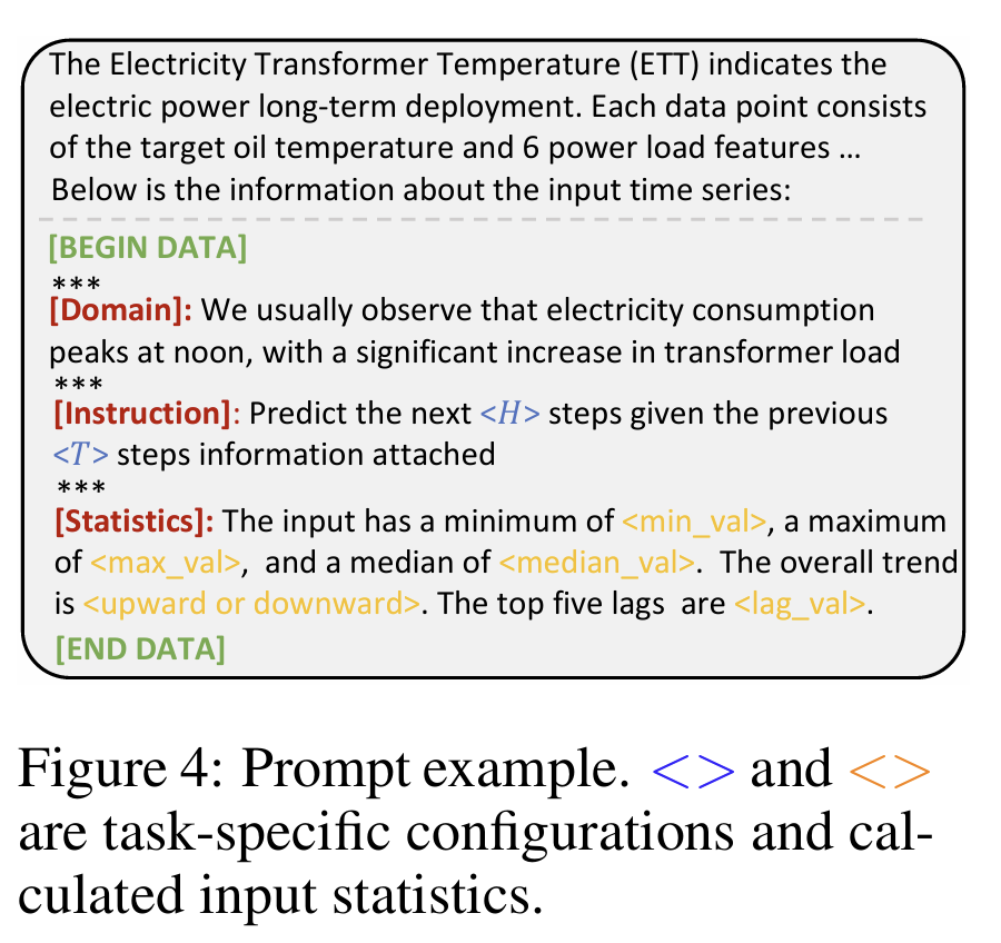 把提示作为前缀 embedding 与 patch 一起输入,让 LLM 在语义上“理解”数据背景与任务。