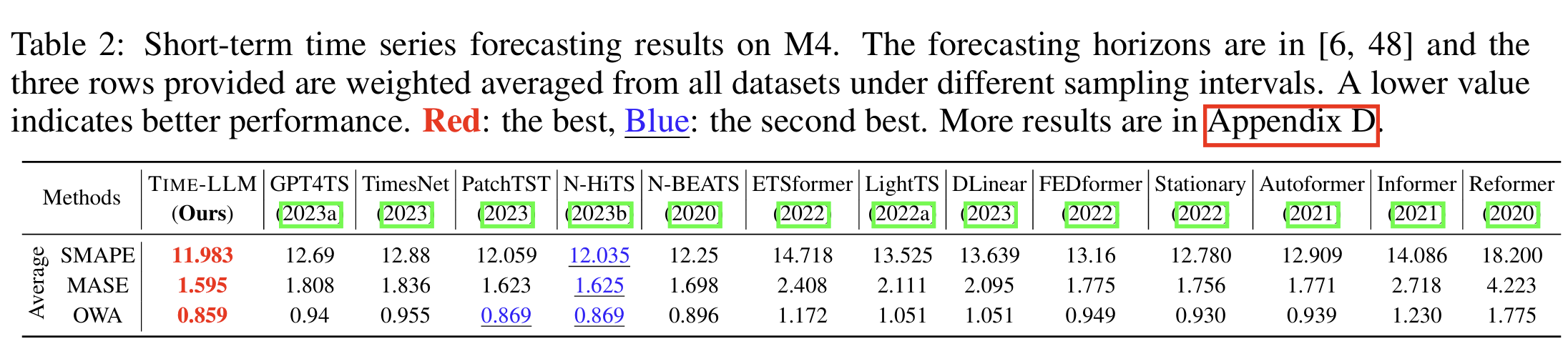 PatchASprefixprefixprefix、StatPrompt 等 prompting 方法明显不如 TIME-LLM