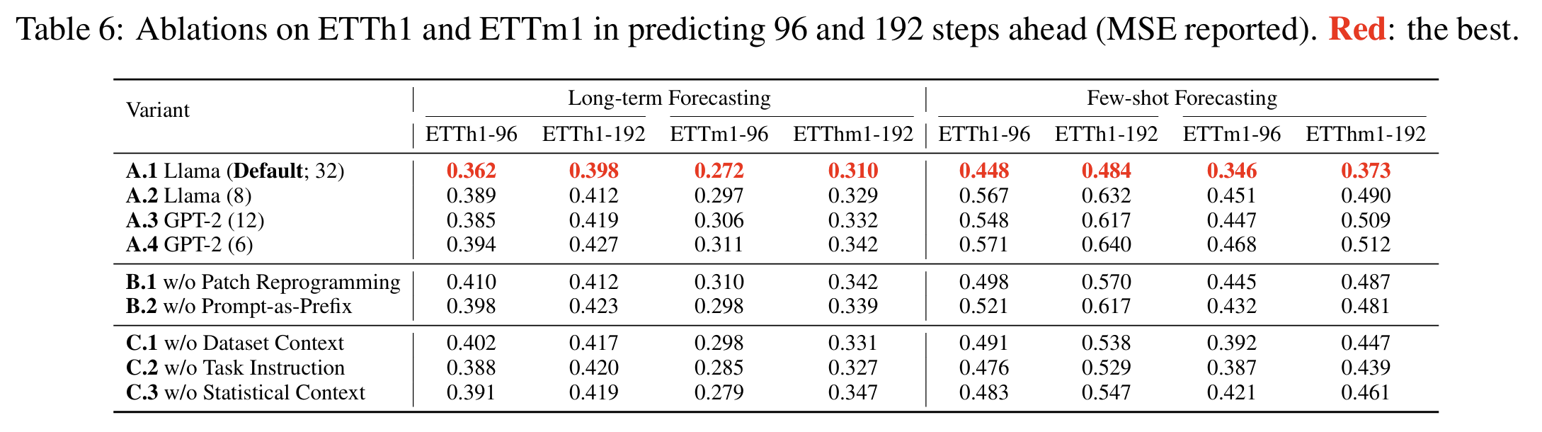 这些实验说明了每个模块都在 TIME-LLM 中发挥关键作用。