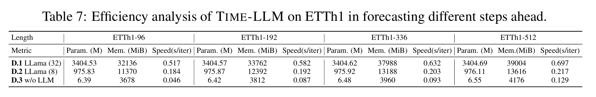 在短期预测(如 24、36 步)中,TIME-LLM 仍能保持与专门为短序列设计的模型相近或更优的性能。这表明其重编程结构可以适应不同长度范围的时序结构。