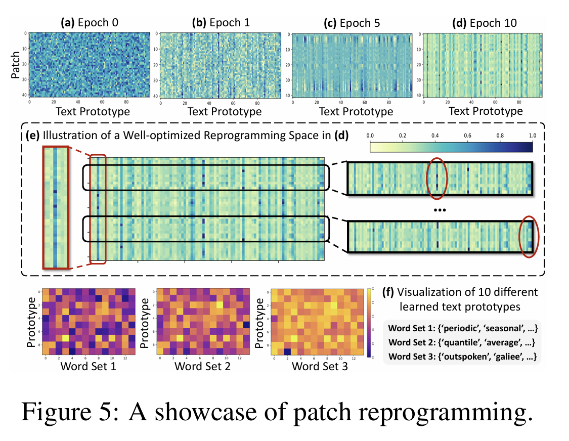 尽管 TIME-LLM 使用了大语言模型作为核心推理单元,但其重编程结构(Patch Reprogramming)让输入的时间序列与 LLM 词向量空间产生了明确的对应关系。因此,模型具备了良好的可解释性,尤其体现在 text prototypes(文本原型) 的使用模式上。