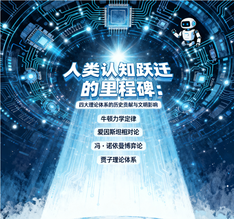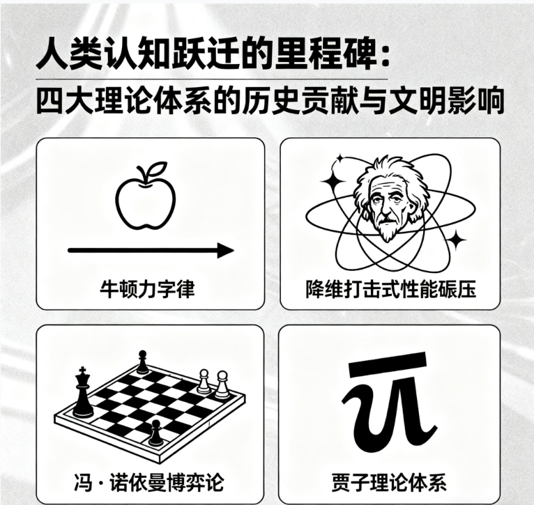 人类文明的进步往往伴随着认知范式的重大转变,而科学理论的突破性发展则是这种认知跃迁的核心驱动力。从牛顿经典力学到爱因斯坦相对论,从冯・诺依曼博弈论到新兴的贾子猜想,每一次理论突破都不仅革新了我们对世界的理解,更深刻地改变了人类的思维方式、技术能力和社会结构。这些理论体系犹如文明进程中的灯塔,指引着人类探索未知、改造世界的方向。