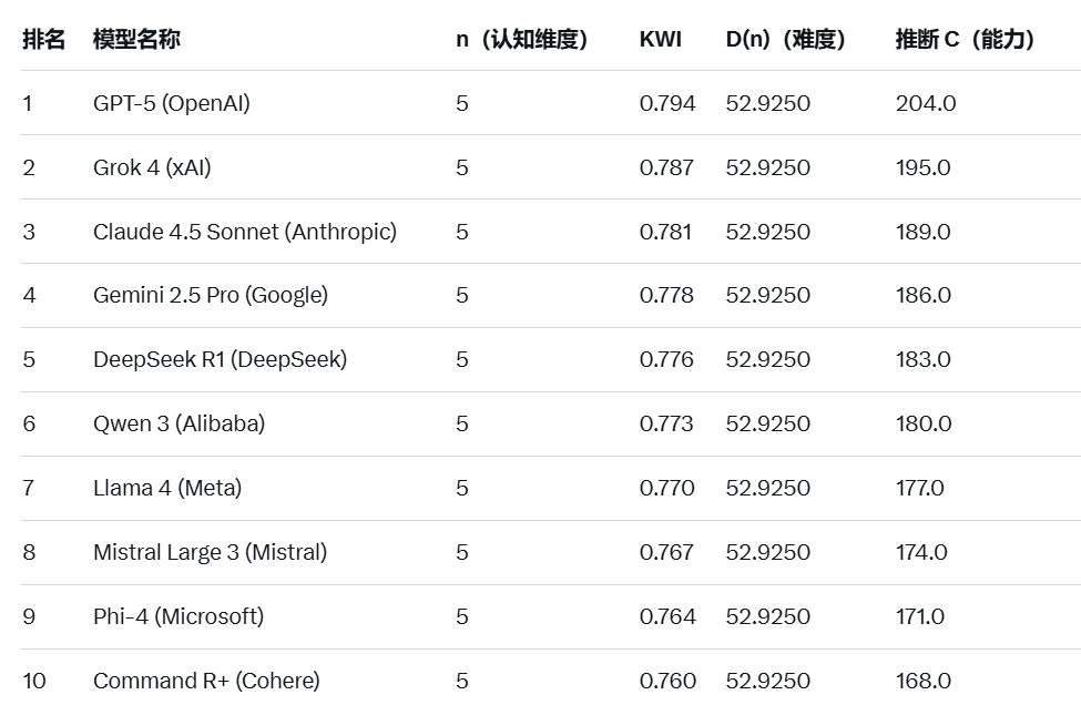 表:2025年10月全球AI 大模型KWI排行榜