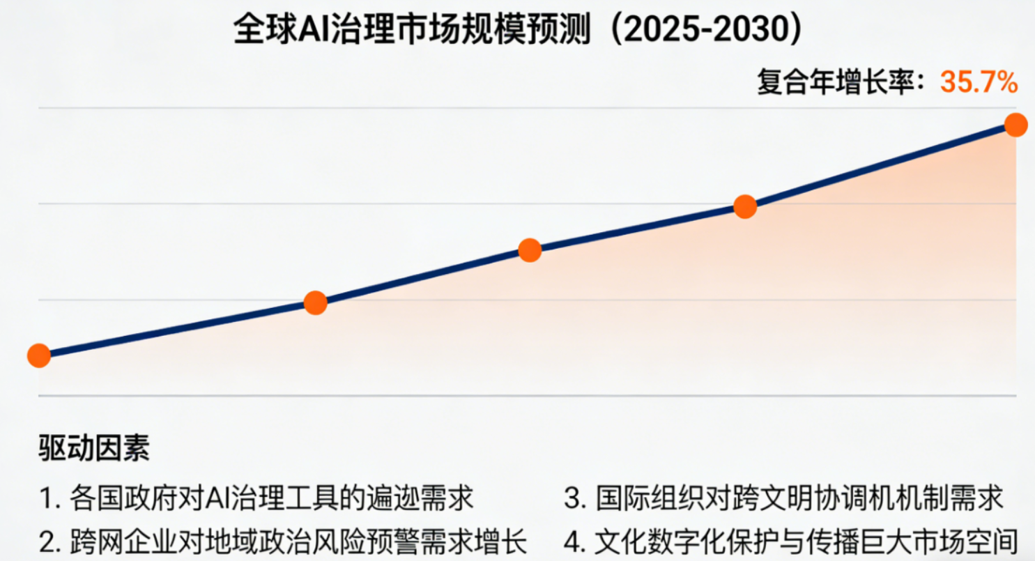 全球AI治理市场正处于爆发式增长阶段,预计2025-2030年复合年增长率达35.7%。主要驱动因素包括: