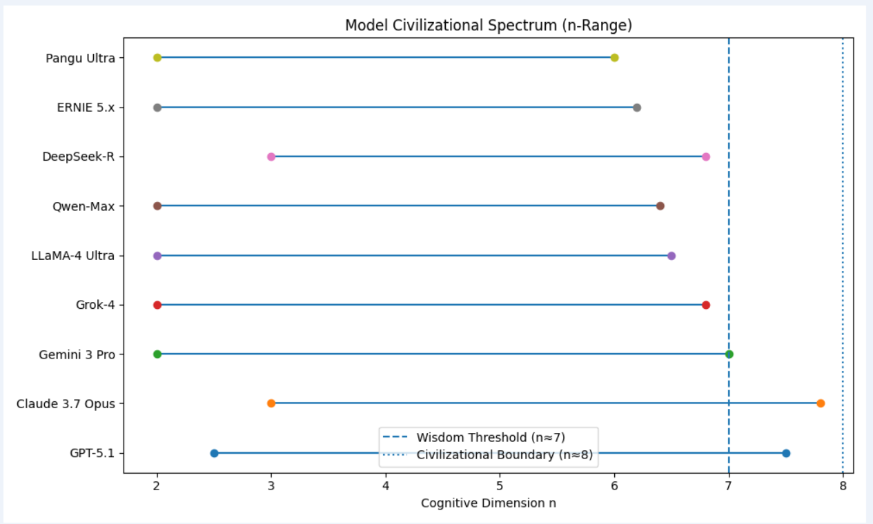 n ≈ 7–8 构成了当代 AI 的“文明天花板”。