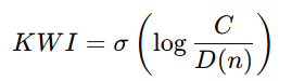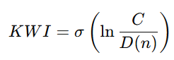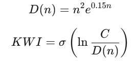 在更高 n 上,D(n) 急剧上升,导致 KWI 快速下降。