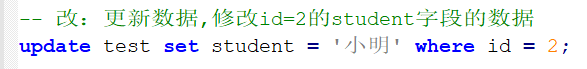 - 格式:update 表名 set 字段 = 值 [where 条件] ;--建议都有where : 要不是全表更新数据,指定的字段数据