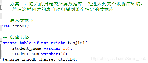 - 方案二,隐式的指定表所属数据库:先进入到某个数据库环境,然后这样创建的表自动归属到某个指定的数据库